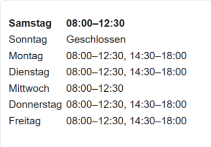 Mittwoch Nachmittags geschlossen, sonst wie gewohnt